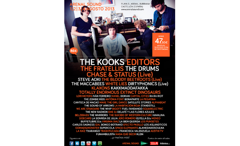 El Arenal Sound sigue sumando nombres a su cartel, en la tanda de hoy han sido confirmados: The Kooks, Ra Ra Riot, Kakkmaddafakka, Chase and Status, Make the Girl Dance, Meneo, Squarelectric, Buffetlibre Djs, SuperCola, Elyella Djs, Space Elephants, The Warriors, Manel y Virginia Díaz.